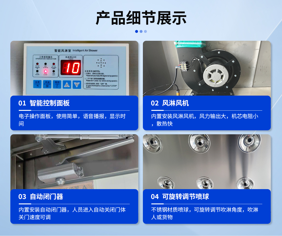 描述:风淋室是一种通用的局部净化设备,安装于洁净室与非洁净室之间。当人与货物要进入洁净区时需经风淋室吹淋,其吹出的洁净空气可去除人与货物所携带的尘埃,能阻断或减少尘源进入洁净区。